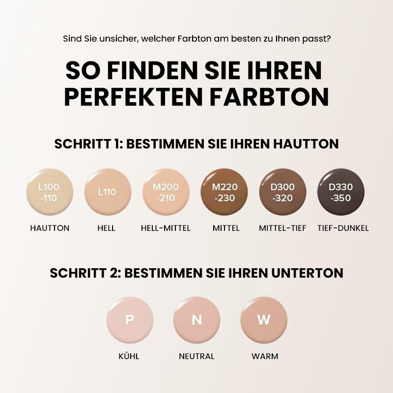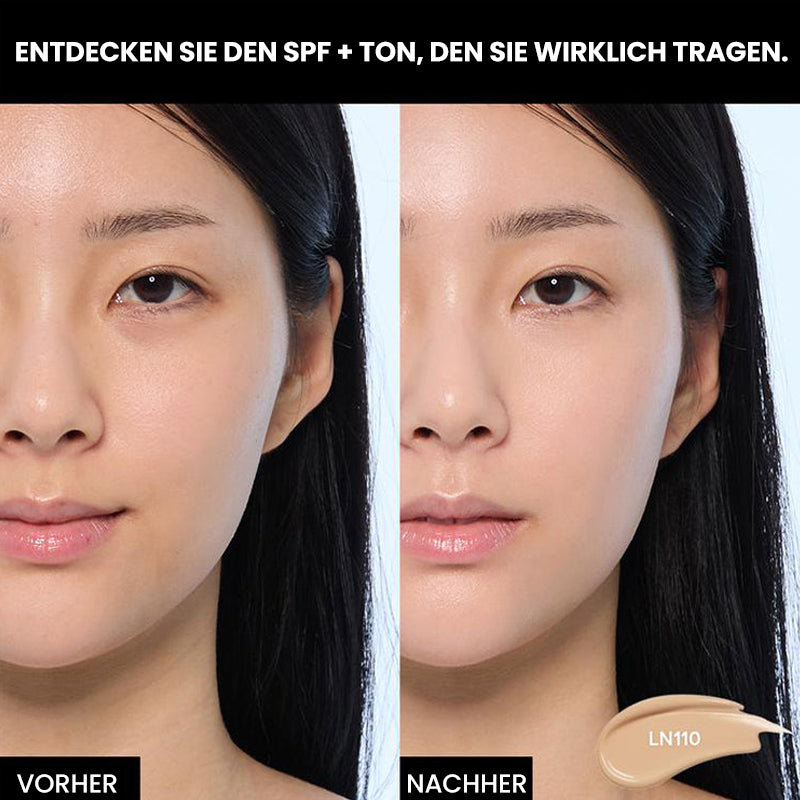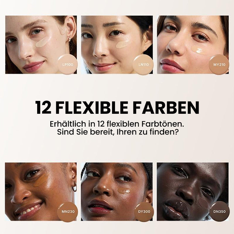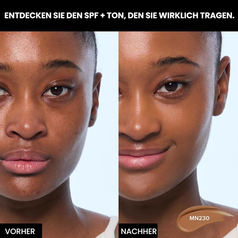 HAUTFREUNDLICH UND FEDERLEICHT | NATÜRLICHES TRAGEGEFÜHL – Ultrafeine, flüssige Textur, die Feuchtigkeit spendet und nicht klebt. Zieht schnell ein – ohne Weißeln, ohne Abrollen und ohne die Poren zu verstopfen. 12 transparente Nuancen passen sich natürlich von heller bis dunkler Haut an, gleichen den Teint aus und sorgen für einen natürlichen Look ohne Make-up-Effekt.