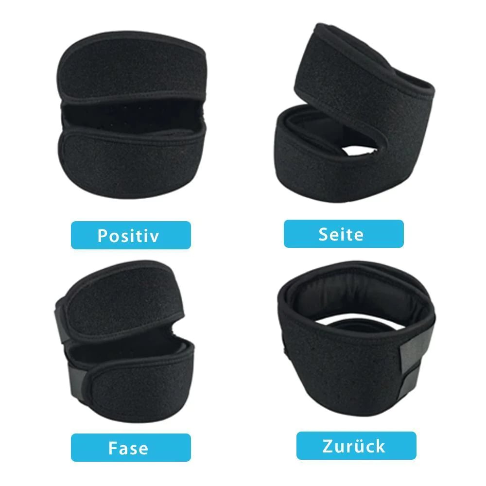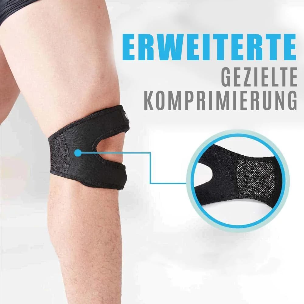 Das untere Kompressionsrohr zielt auf die Patellasehne ab, und das obere Kompressionsrohr zielt auf eine Quadrizepsfehlausrichtung ab, um die Patellaspurhaltung zu verbessern.