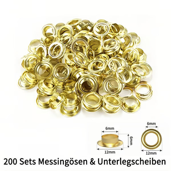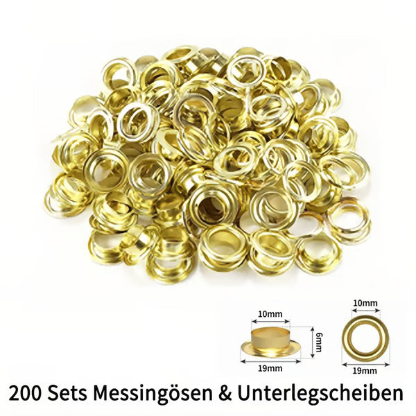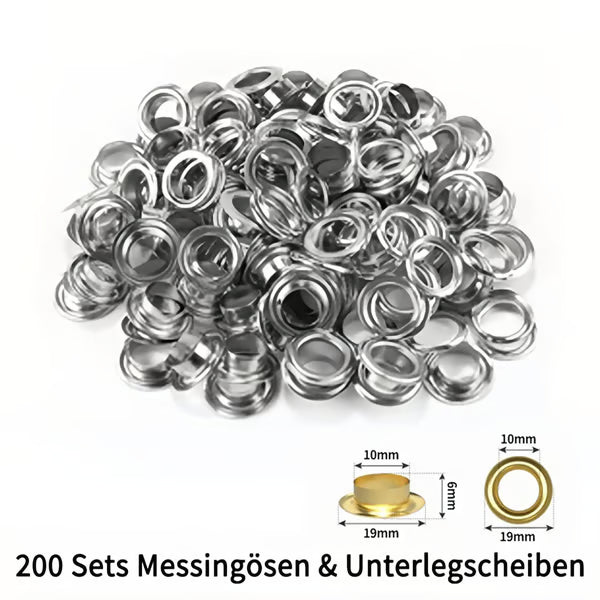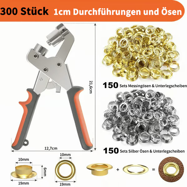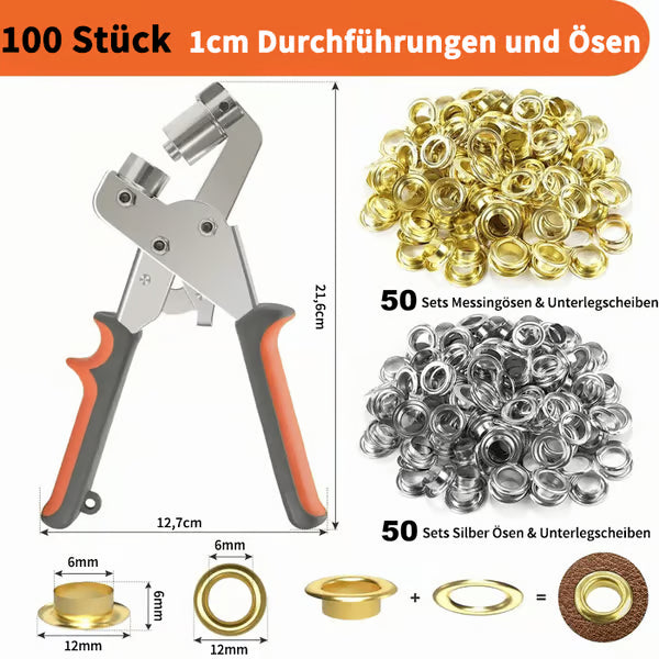 Das Ösen-Werkzeugset besteht aus Stahl und PVC-Gummi und ist reibungsfest, rutschfest und griffig.