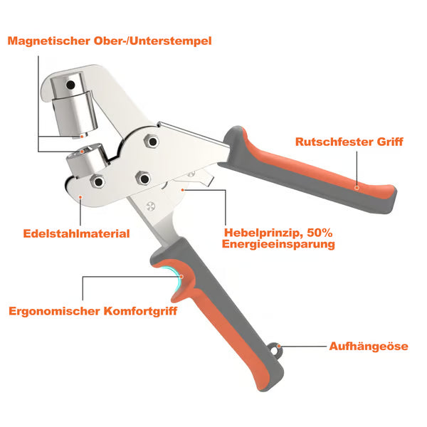 Der Ösen-Werkzeugsatz mit Doppelhebelmechanismus spart über 50 % Kraft. Der ergonomische Griff liegt gut in der Hand und ermöglicht maximale Kraftabgabe. Die hohe Durchdringung erleichtert und komfortables Arbeiten.