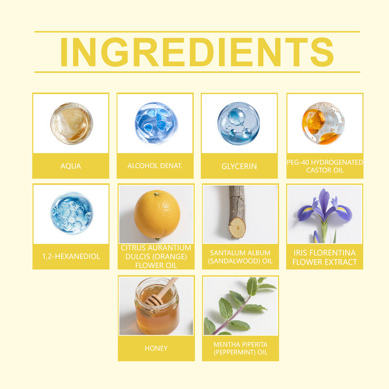 Inhaltsstoffe: Aqua, Alcohol Denat, Glycerin, PEG-40 Hydrogenated, 1.2-Hexanediol, Honig u. a.