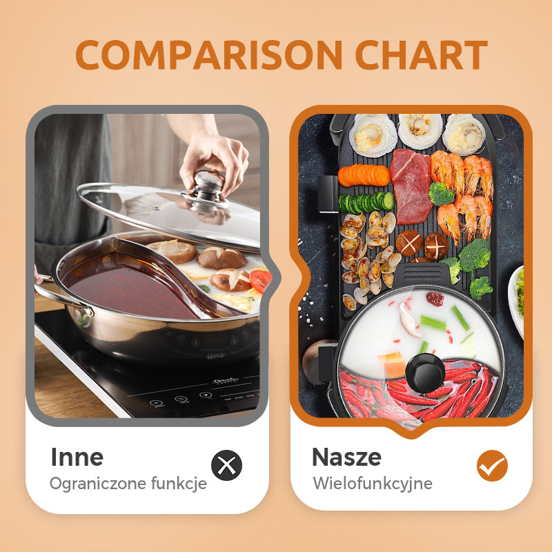 PODWÓJNE DOŚWIADCZENIE GOTOWANIA – Ciesz się idealnym połączeniem hot pot i grilla w jednym urządzeniu. Dzięki temu rozwiązaniu łatwo przygotujesz rodzinny obiad lub spotkanie ze znajomymi, oferując wszechstronny sposób gotowania, który oszczędza miejsce i maksymalnie wydobywa smak potraw. Nie musisz przełączać się między urządzeniami – gotuj zupy, grilluj i przygotowuj inne potrawy podczas jednej sesji.