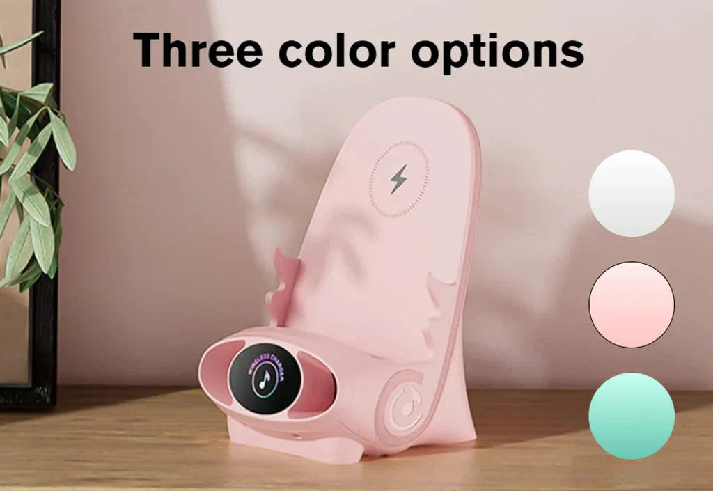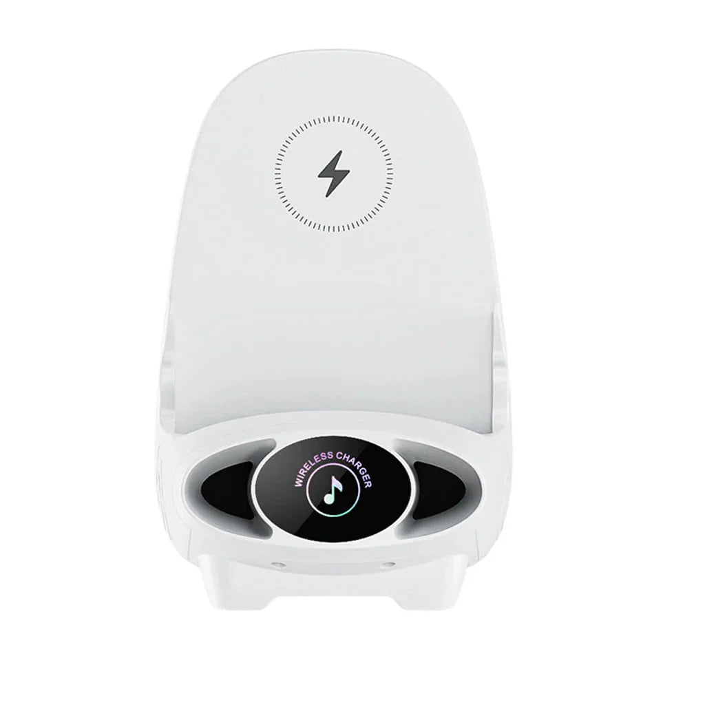 Einzigartig und neuartig: Die kabellose Lade-/Handyhalterfunktion kann horizontal oder vertikal platziert werden und an der Unterseite befindet sich ein Schallloch, um den Klang bei der Wiedergabe des Telefons dreidimensionaler zu gestalten.