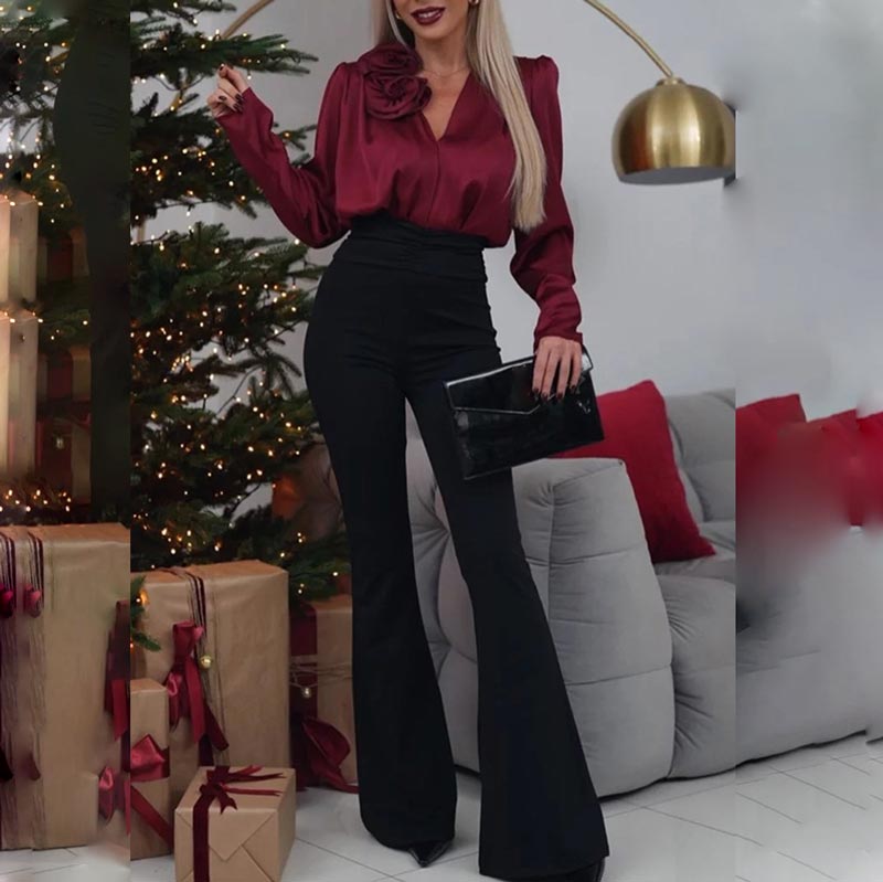 Lieferumfang: 1 * Damen Satin Bluse mit V-Ausschnitt und Rosen-Detail