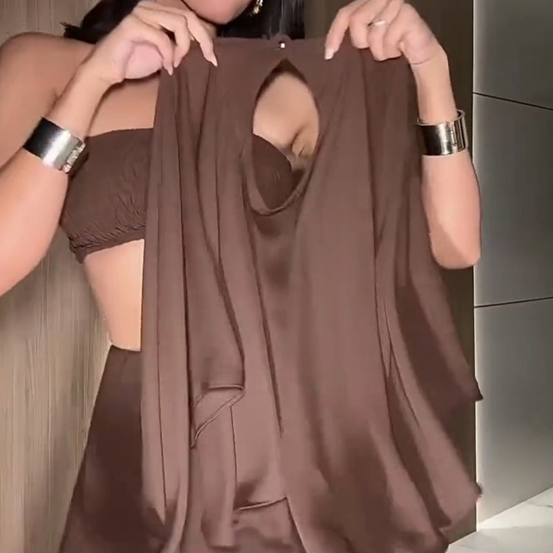 KURZES TOP MIT FLIEßENDEM RÜCKENSAUM – Dieses zweiteilige Set besteht aus einem trendigen, unregelmäßigen, kurzen Top, das Ihre Taille betont und einen verspielten, fließenden Rückensaum für mehr Bewegung und Weiblichkeit bietet. Der Minirock vereint modernen Charme mit müheloser Anmut.
