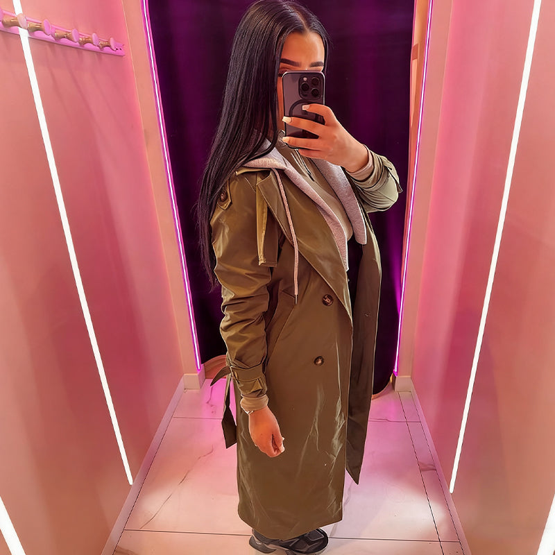 Im Paket enthalten: 1 × Damen-Mantel mit Kapuze, Reverskragen, Fake-Zweiteiler-Optik, lässiger langer Trenchcoat
