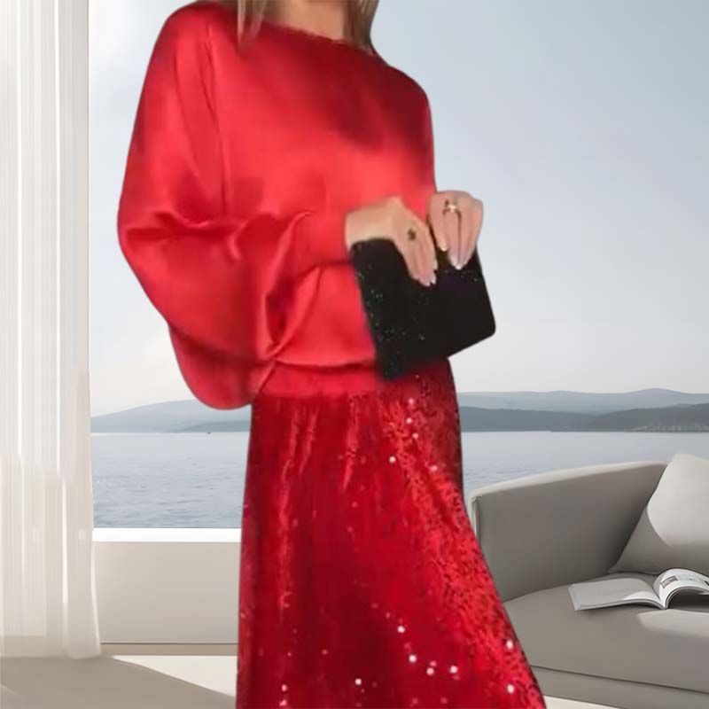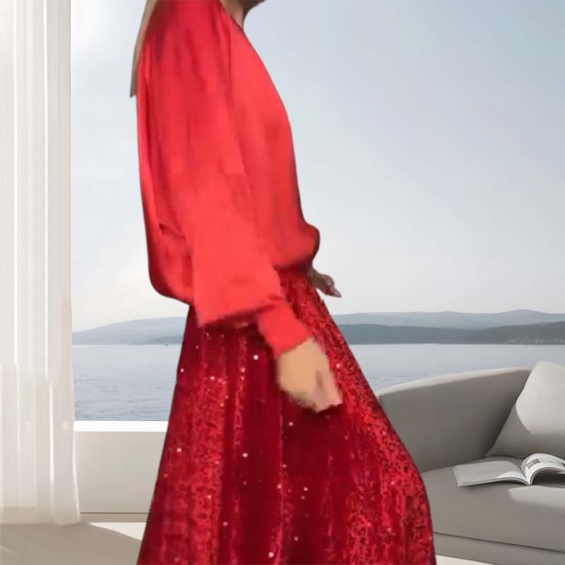 💃Zweiteiliges Set aus langärmeligem Top und Pailletten-Maxirock für Damen