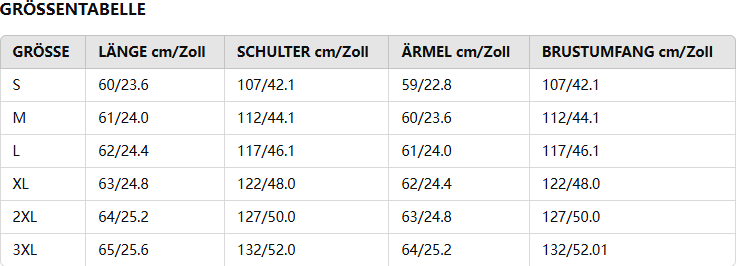 | GRÖSSE | LÄNGE cm/Zoll | SCHULTER cm/Zoll | ÄRMEL cm/Zoll | BRUSTUMFANG cm/Zoll |